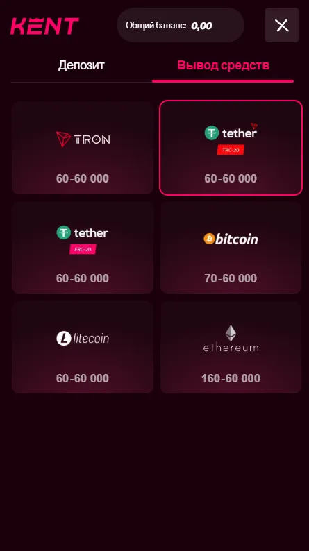 Официальный сайт Кент подходит как для новичков с низкими ставками, так и для игроков с высоким оборотом. Порог входа минимален, а максимальные лимиты — одни из самых щедрых на рынке. В Kent casino минимальный вывод — 500 ₽ или эквивалент в другой валюте. Максимальные лимиты зависят от статуса в VIP-программе – от 300 000 до 30 000 000 ₽.